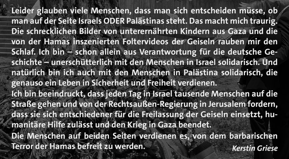 Leider glauben viele Menschen, dass man sich entscheiden müsse, ob man auf der Seite Israels ODER Palästinas steht. Das macht mich traurig. Die schrecklichen Bilder von unterernährten Kindern aus Gaza und die von der Hamas inszenierten Foltervideos der Geiseln rauben mir den Schlaf. Ich bin – schon allein aus Verantwortung für die deutsche Geschichte – unerschütterlich mit den Menschen in Israel solidarisch. Und natürlich bin ich auch mit den Menschen in Palästina solidarisch, die genauso ein Leben in Sicherheit und Freiheit verdienen. Ich bin beeindruckt, dass jeden Tag in Israel tausende Menschen auf die Straße gehen und von der Rechtsaußen-Regierung in Jerusalem fordern, dass sie sich entschiedener für die Freilassung der Geiseln einsetzt, humanitäre Hilfe zulässt und den Krieg in Gaza beendet. Die Menschen auf beiden Seiten verdienen es, von dem barbarischen Terror der Hamas befreit zu werden.