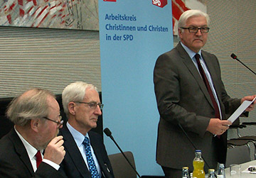 Mehr als 200 Interessierte kamen zur Jahreskonferenz des Arbeitskreises „Christinnen und Christen in der SPD“ (AKC). Bei der gemeinsam mit der SPD-Bundestagsfraktion veranstalteten Tagung ging es um die Frage „Brauchen wir eine neue Balance von Staat, Kirche und Religionsgemeinschaften?“ Sowohl Frank-Walter Steinmeier als auch der ehemalige Bundesjustizminister Jürgen Schmude stellten eingangs fest, dass unser Staat religiös neutral bleiben müsse, aber gleichzeitig Kirchen und Religionsgemeinschaften aktiv fördere.