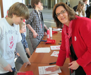 „Als Vorsitzende des Familienausschusses des Bundestages habe ich mich immer für Kinderrechte und mehr Bildung für Kinder eingesetzt und tue dies auch weiterhin“, so Kerstin Griese. „Deshalb habe ich auf das Blatt Papier mit meinem roten Handabdruck geschrieben: Kinder wollen Bildung und Frieden! Keinen Einsatz als Kindersoldaten!“