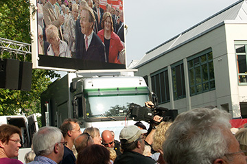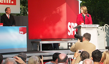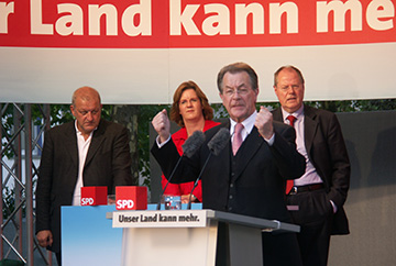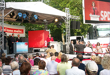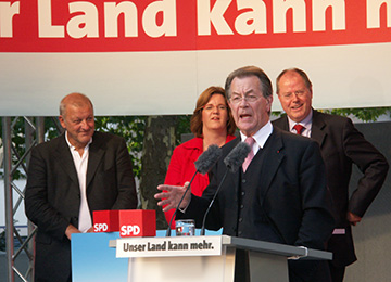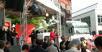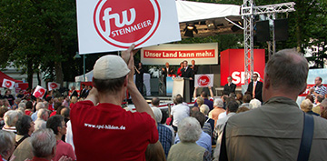 Peer Steinbrück wurde anschließend grundsätzlich und sprach über weltweiten Konsequenzen der Finanzmarktkrise. In seiner gewohnt unterhaltsamen Rede warnte er davor, auf das Steuersenkungs-Versprechen hineinzufallen. Riesen Begeisterung gab es dann bei Franz Müntefering. wdr.de schreibt: „Während Müntefering die große Politik erklärt, klatschen die Velberter begeistert Beifall. Für die SPD ist die Veranstaltung klar ein Heimspiel.“ In seiner halbstündigen Ansprache schaffte Müntefering es, die Menschen mitzureißen. „Das sozialdemokratische Projekt ist nicht am Ende“, rief er unter großem Beifall. Der SPD-Vorsitzende zeigte sich in Hinblick auf den Tag der Bundestagswahl siegessicher.