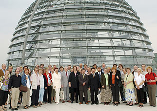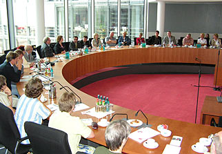 Wichtigster Punkt des Programms war eine Diskussion mit Wolfgang Thierse, der dem Zentralkomitee der Katholiken angehört. Der Bundestagspräsident sprach mit der Gruppe, zu der unter anderem die beiden evangelischen Superintendenten Rolf Breitbarth (Kreis Niederberg) und Frank Weber (Kreis Mettmann) gehörten, über Politik, Kirche und Toleranz. „Das war eine beeindruckende Diskussion“, waren sich die mitgereisten Gemeindeglieder einig. Das Gespräch fand im Bundestags-Sitzungssaal des Familienausschusses, die Ausschussvorsitzende Griese leitete die Diskussion. „Kirche kann und muss sich in gesellschaftliche Auseinandersetzungen einmischen“, zeigte sich die Abgeordnete überzeugt. Sie freute sich über das große Interesse bei den Gemeinden an politischen Fragen. „Ich hoffe, mit der Reise auch einen Beitrag zum interkonfessionellen Dialog in meinem Wahlkreis geleistet zu haben.“