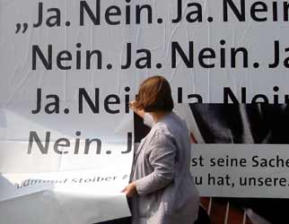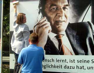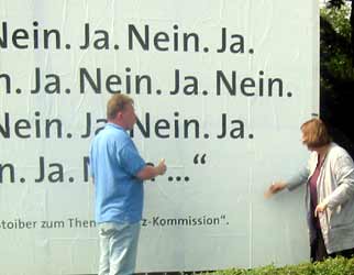 Selbst Hand hat die Velberter Bundestagsabgeordnete Kerstin Griese bei einem neuen Plakat angelegt. Zunächst musste ein großes Schröder-Plakat eingekleistert werden, damit die Poster mit ihrer Ja. Nein -Beschriftung ordentlich halten. Worum es bei dem Großflächen-Plakat geht, wurde erst am Ende deutlich: Edmund Stoiber zum Thema ,Hartz-Kommission.
