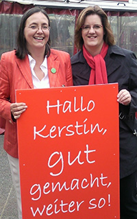 Griese schenkt der grünen Ex-Staatsministerin Kerstin Müller ein „Hallo Kerstin“-Plakat. Müller ruft dazu auf, mit der Erststimme Griese zu wählen.
