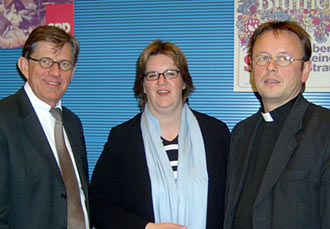„Es gibt keine Alternative zum Dialog mit dem Islam“, betonte der Prälat und war sich darin mit seinem katholischen Kollegen Karl Jüsten einig. Dieser stellte klar, dass zur grundlegenden Menschenwürde die gegenseitige Achtung aller religiösen Bekenntnisse gehört. Das Wissen über den jeweils anderen Glauben und die Kultur, seien dabei ein sehr wichtiger Faktor. Allerdings müsse jeder Gläubige auch damit rechnen, aufgrund seiner Religion kritisiert zu werden. Jüsten plädierte für einen souveränen Umgang mit solcher Kritik, Spott und Satiren und zitierte den Vorsitzenden der evangelischen Kirche, Bischof Huber: „Der liebe Gott ist so souverän, dass er, wenn über ihn gelästert wird, nicht zum Bundesverfassungsgericht geht.“ Die Politisierung von Religion und den damit verbundenen Aufruf zur Gewalt lehnten sowohl der Vertreter der evangelischen als auch der katholischen Kirche entschieden ab: „Religion soll eine friedensstiftende Funktion haben.“