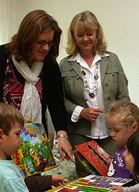 Kerstin Griese schenkt Beate Richter und den Junior-Welt-Kindern das Brettspiel „Da ist der Wurm drin“.