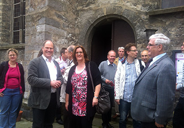 „Die Kirche ist hier im wahren Sinne des Wortes im Dorf, sie bildet den Mittelpunkt des Platzes mit den schönen alten Fachwerk- und Schieferhäusern drumherum“, beschrieb Kerstin Griese das auffällige Stadtbild. Für die evangelisch-reformierte Gemeinde und ihre 4600 Gemeindemitglieder berichtet Pfarrer Gruber über die zahlreichen Aktivitäten in der Jugend- und Freizeitarbeit und über die vielen Projekte, die soziales Engagement in der Stadt fördern. Griese, die Kirchenbeauftragte der SPD-Bundestagsfraktion ist, nahm sich auch Zeit für das Gespräch mit den Mitgliedern des Presbyteriums über die Arbeit der Gemeinde. Von der Jugendarbeit bis zu den Angeboten für Senioren und zum Sonntagsgottesdienst gingen die Themen. Griese sieht ihre Aufgabe auch als Brückenbauerin zwischen Kirche und Politik, dementsprechend munter verlief die Diskussion in Neviges.