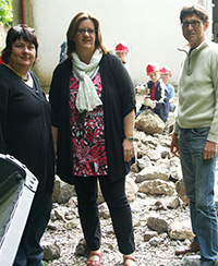 Andrea Gellert, Kerstin Griese und Manfred Hoffmann am „Klopfplatz“, wo Kinder wie Kalkarbeiter mit Hammer und Meißel arbeiten.