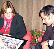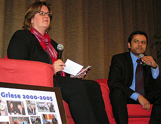 Kerstin Griese (38) ist seit fünf Jahren Mitglied des Bundestages. Ihr Abgeordnetenkollege Sebastian Edathy (35) überreichte ihr zu Beginn der „Kerstin Griese trifft …“-Veranstaltung ein Bild mit verschiedenen Fotos aus ihrer fünfjährigen Parlamentstätigkeit. Edathy verband seine Gratulation mit guten Wünschen für die nächsten fünf Jahre – „und danach sehen wir mal weiter“. Kerstin Griese war sichtlich überrascht, dass ihr „Bundestagsjubiläum“ mit einem Bildergeschenk und einem Blumenstrauß gefeiert wurde. Sie bedankte sich sehr herzlich bei ihrem Team und den SPD-Ortsvereinen für die Unterstützung ihrer Arbeit. Im Mai 2000 war sie als Nachrückerin für den damals zum Wehrbeauftragten gewählten Wuppertaler Abgeordneten Wilfried Penner in den Bundestag eingezogen. Seit 2002 ist sie direkt gewählte Abgeordnete für Niederberg und Ratingen.