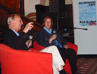 Selbstbewusst sagte Klaus Staeck, dass er den Leuten nun seit 30 Jahren auf die Nerven gehe. Er fragte Kerstin Griese, was denn die SPD, was denn die Politik tun könne. Die Politik kann viel tun, anwortete die Velberter Abgeordnete. Rot-grün habe mit dem Atomausstieg eine ganz wichtige Entscheidung getroffen. Es komme sehr oft darauf an, die Entscheidungen den Menschen zu vermitteln. So müsse beispielsweise auch gesagt werden, dass erneuerbare Energien 100.000 Arbeitsplätze geschaffen hätten. Und am 22. September ständen klare Alternativen zur Wahl. Stoiber werde das Rad wieder zurückdrehen. Der hat noch nicht mal einen Menschen, der für Umweltpolitik zuständig ist, in seinem so genannten Kompetenzteam.