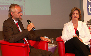 „Mehr als 50 Gäste haben bereits auf dem roten Sessel Platz genommen. Auf diesen Gast habe ich mich ganz besonders gefreut“, wurde Frank-Walter Steinmeier zu Beginn von Kerstin Griese begrüßt. Etwa 400 interessierte Bürgerinnen und Bürger füllten die Sitzreihen im großen Saal des Forum Niederberg und hörten dem Vizekanzler gespannt zu, nachdem dieser mit Verspätung aus dem niederrheinischen Emmerich angekommen war. „Ich habe nicht gesagt, wir werden bis 2020 vier Millionen neue Arbeitsplätze schaffen, ich sage, wir können das bis 2020 schaffen, wenn wir die Weichen richtig stellen“, erläuterte Steinmeier seinen Deutschland-Plan. Er plädierte für eine nachdrückliche Förderung neuer Technologien und der regenerativen Energie. Wer den Wiedereinstieg in die Atomenergie fordere, zerstöre Deutschlands Weltmarkt-Führung bei den erneuerbaren Energien.
