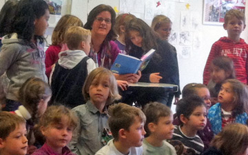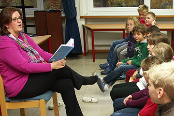 Nachdem sie die erste Schulstunde in der Nordstadt verbracht hat, wechselte Griese in das Ratinger Medienzentrum. Dort erwarteten die ersten und zweiten Klassen der Minoritenschule die SPD-Abgeordnete. Auch dort hörten die Kinder gebannt zu, als Griese die beiden Märchen vortrug.