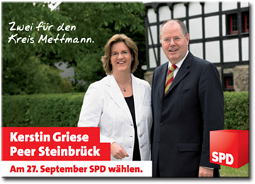 Klassische Wahlkampfmaterialien seien jedoch „mindestens genauso wichtig“. So fährt der Kerstin-Griese-Bus mit seinem Straßencafé und einer Musik- und Mikrofonanlage durch den Wahlkreis. Es gibt tausende Faltblätter, Postkarten zu Schwerpunktthemen und den aufblasbaren „Wahlfisch“ als Maskottchen. Erstmals gibt es auch Großflächenplakate, auf denen Kerstin Griese gemeinsam mit dem zweiten Kreis-Mettmann-Kandidaten Peer Steinbrück zu sehen ist.