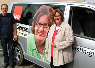 Auch bei diesem Wahlkampf ist ein Wa(h)lfisch das Maskottchen Kerstin Griese. Die 38-jährige Abgeordnete stellte in ihrem Bürgerbüro ihr Wahlkampfkonzept und den neuen Kerstin-Griese-Bus vor. „Der Bus wird in den heißen Wahlkampfwochen täglich im Einsatz sein und für Informationen, Musik und Unterhaltung sorgen“, sagte Griese.