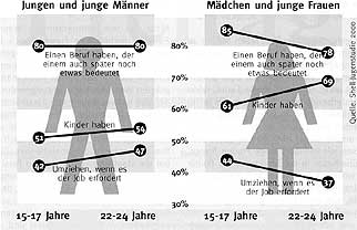 An die wirtschaftliche Notwendigkeit, Frauen mit allen ihren Fähigkeiten und Begabungen am Prozess der Erwerbsarbeit zu beteiligen, wird zur Zeit immer wieder apelliert. Das stimmt, ist ein hilfreiches Argument, soll hier aber nicht im Vordergrund stehen. Ganz parteiisch geht es im Sinne der Generation junger Frauen um gleiche Chancen und Möglichkeiten. Als die 13. Shell-Jugendstudie im Jahr 2000 aufzeigte, dass noch im Alter von 15 bis 17 Jahren der Wunsch nach beruflicher und nach familiärer Orientierung bei Jungen und Mädchen etwa gleich stark ausgeprägt ist, dann aber bei den Mädchen mit 22 bis 24 Jahren die berufliche Orientierung zugunsten der Familie zurückgeht, wurde noch einmal deutlich: Der Familientrieb ist nicht angeboren. Vielmehr ist es positiv zu bewerten, dass junge Frauen sich heute zutrauen, beruflich erfolgreich zu sein und eine Familie zu haben. Das erleben die jungen Frauen allerdings angesichts des gesellschaftlichen Klimas in Deutschland häufig als unrealisierbar. Denn noch immer gibt es den Begriff der Rabenmutter, Rabenväter sind dagegen noch nicht erfunden worden.